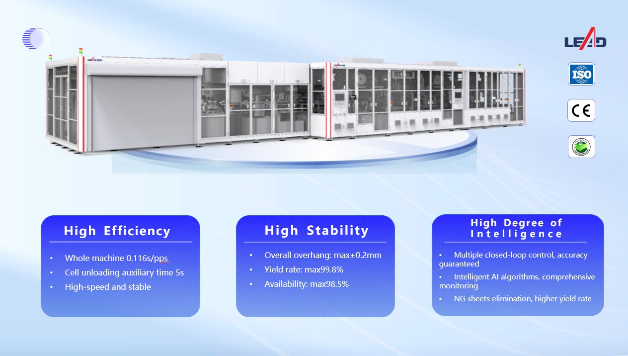 Currently, the industry has an capacity of more than 0.125 s/pcs, an overall cell overhang of ±0.3mm, and a yield rate of 99.5%. LEAD’s fifth-generation high-speed cutting and stacking machine has a clear edge over others. As onsite staff explained, this model employs multiple self-developed innovative technologies, enhancing production capacity through multiple closed-loop control at the unit level, and introducing AI algorithms for product flow and information processing. Through comprehensive monitoring of the production process, it significantly improves quality control capabilities and the efficiency of eliminating NG sheets.