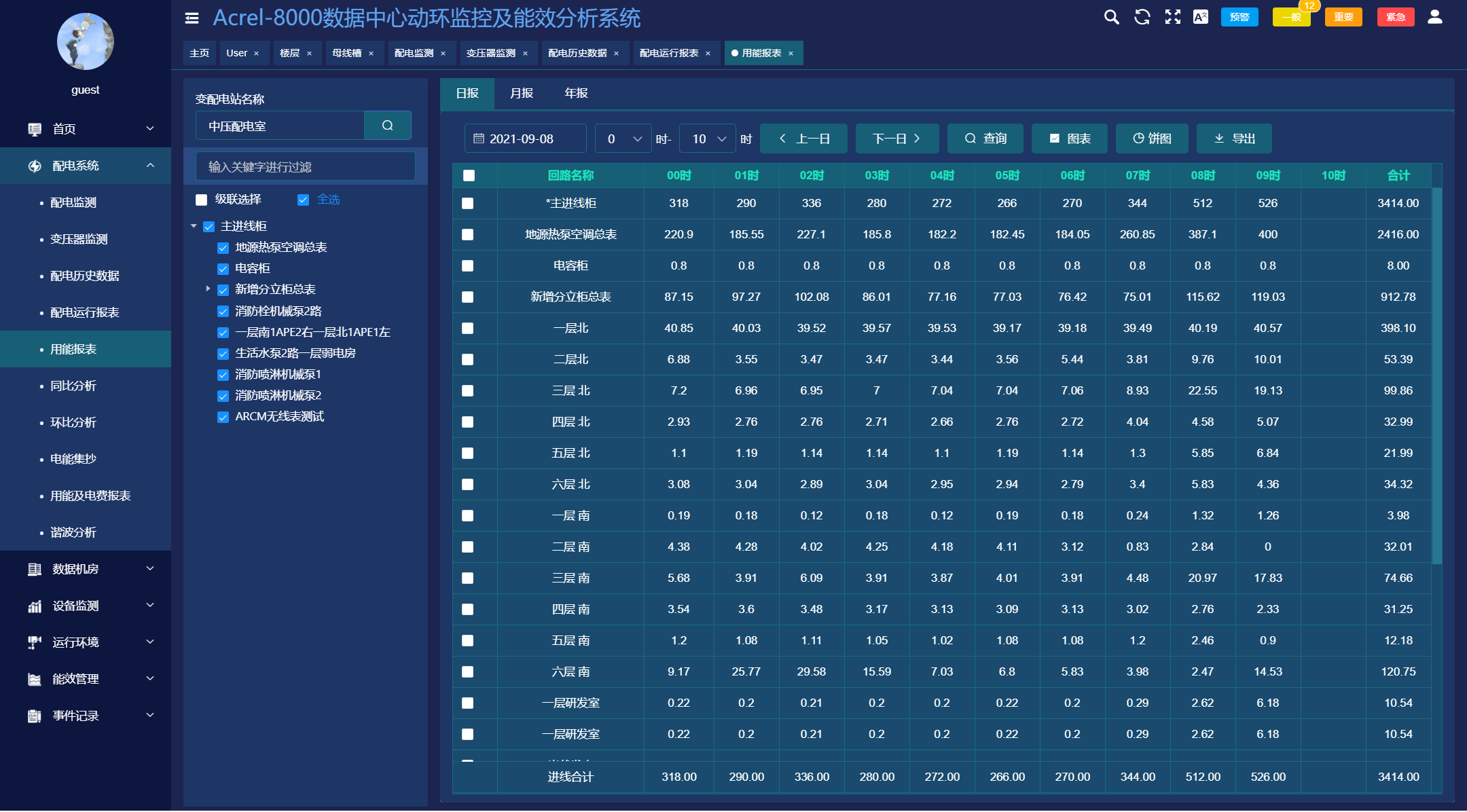 系统可以展示精密配电柜内进线和馈线回路电气参数,包括电流电压功率电能以及开关状态,并可以对数据进行报警设置和分级,数据取自精密配电柜测量模块。