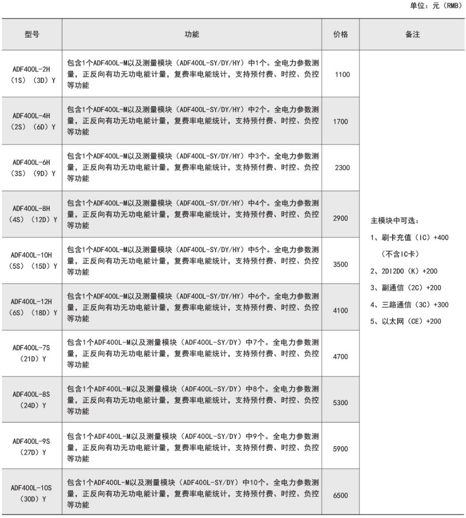 产品简介:ADF400L系列多用户电能表,通过模块组合的方式最大可实现12路三相或36路单相的直接接入测量或12路三相互感器接入测量、直接接入和互感器接入的混合测量方式,该系列电能表因准确度高、集中安装、集中管理、安装灵活性高,互不干扰等优势深受小区、学校、企业等的青睐。该系列仪表支持预付费功功能。