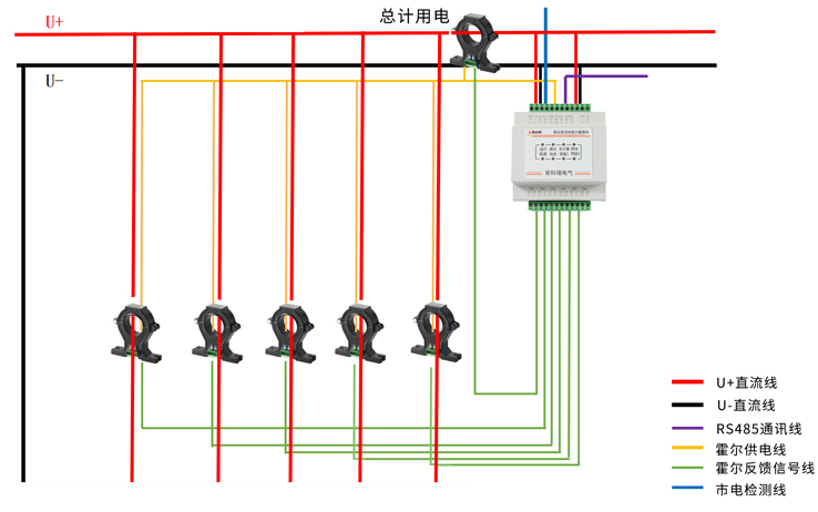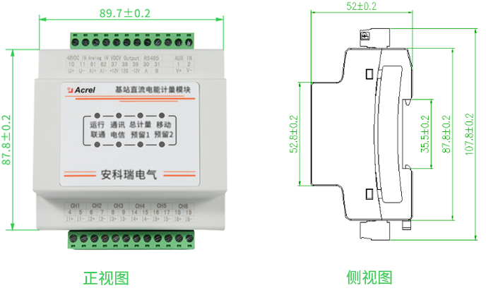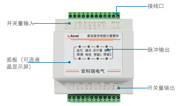 AMC16-DETT 基站直流电能计量模块主要是针对有共享需求,且开关电源无分用户电量计量功能的基站而设计的。仪表可对六个回路的直流电能进行计量,并可为配套的霍尔传感器提供工作电流,同时可通过上位机软件实现零漂校准,具有遥测、遥 信、遥调、实时电量计量、供电质量异常告警、信息存储及处理、信息交互等功能。该模块可分别计量三家运营商的直流用电量,为基站节能改善提供详细的数据依据,为直流配电设备提供分项计量解决方案。
