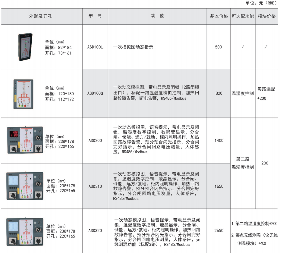 ASD系列开关柜综合测控装置具有一次回路模拟图及开关状态指示、高压带电显示、自动温湿度控制、人体感应自动照明、语音提示、电参数测量及RS485通讯接口等功能,集操作、显示于一体,直观地体现柜内元件的工作状态及工作环境。