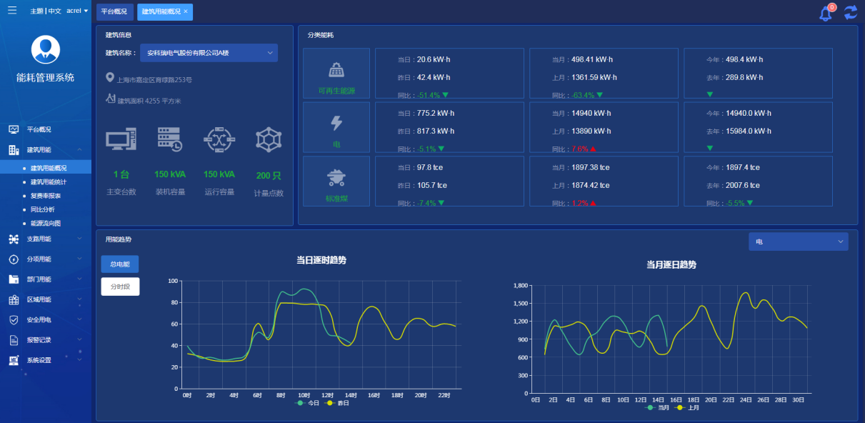对建筑、部门、区域、支路、分类分项等用能进行对比,支持当日逐时趋势、当月逐日趋势曲线、分时段能耗统计对比、总能耗 同环比对比。