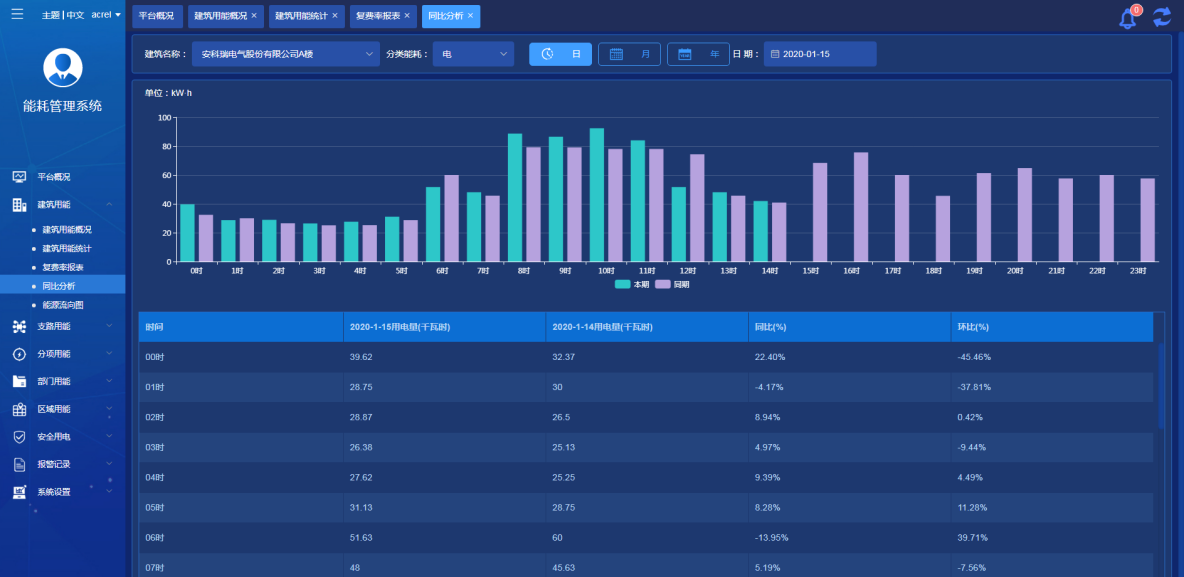 对建筑、分项、区域、支路等用能按日、月、年以图形和报表结合的方式进行用能数据同比分析。