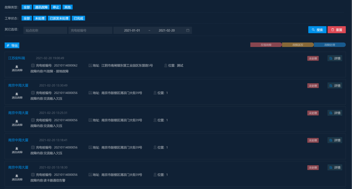 对平台连接的所有充电桩状态进行监视,充电桩发生异常情况时可通过APP、短信及时向运营人员发出报警信号,及时消除火灾隐患。