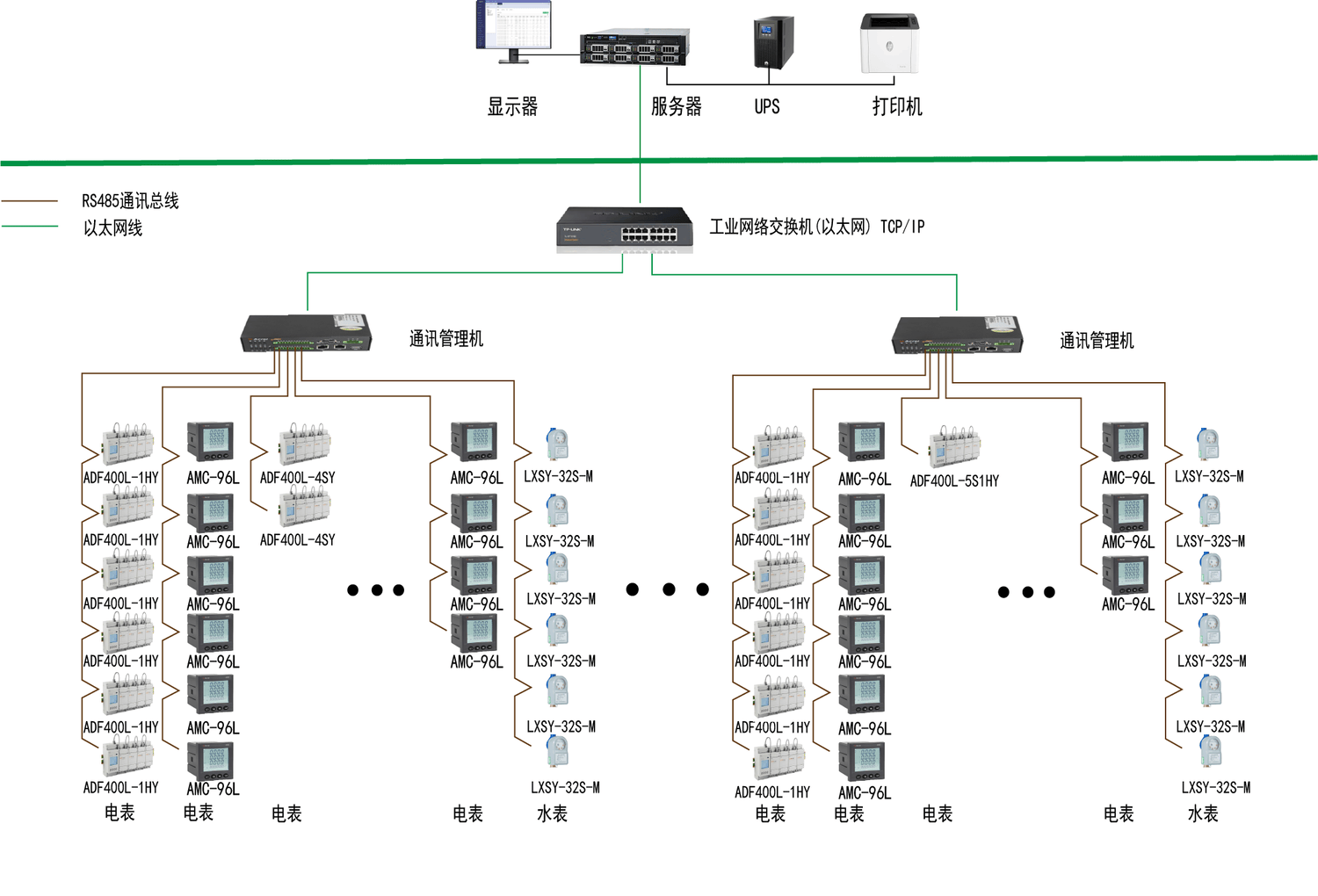 该项目现场设备层仪器仪表共计ADF400L各系列电表共计56块,AMC96L电表56块,水表93块。四个采集箱安装在负一层,所有电表水表通讯线在负一层连接到采集箱。