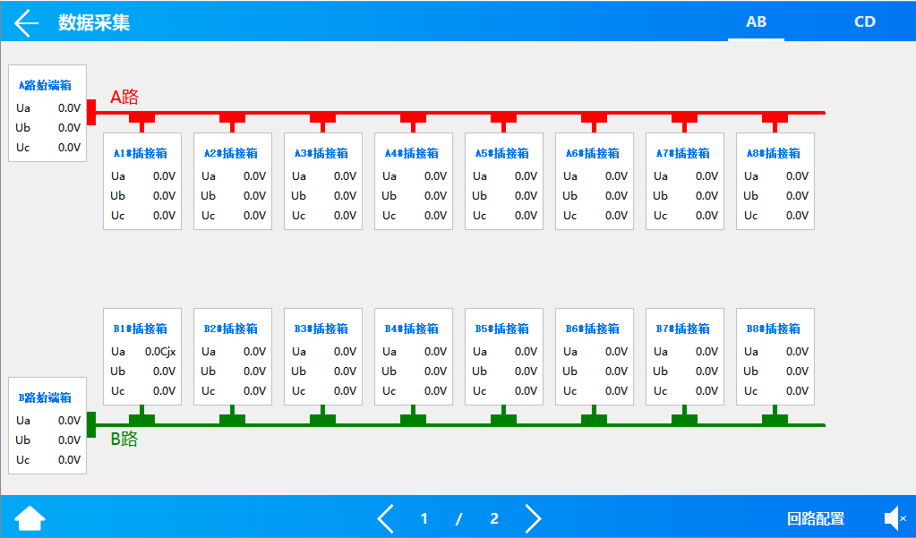 在主页点击数据采集按钮后,进入系统图界面:此界面显示了每个箱子的电压。