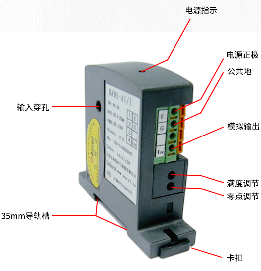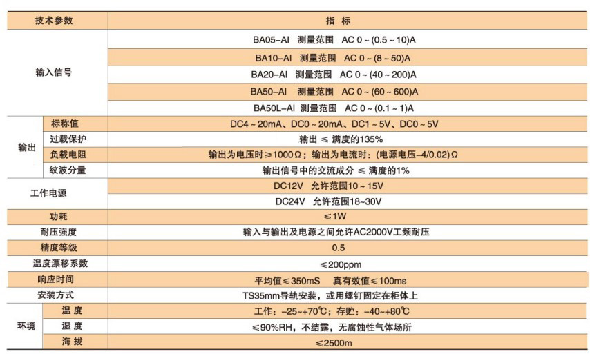 产品简介:BA系列产品应用电磁感应原理,对电网中的交流电流进行实时测量,将其隔离变换为标准的直流信号输出。